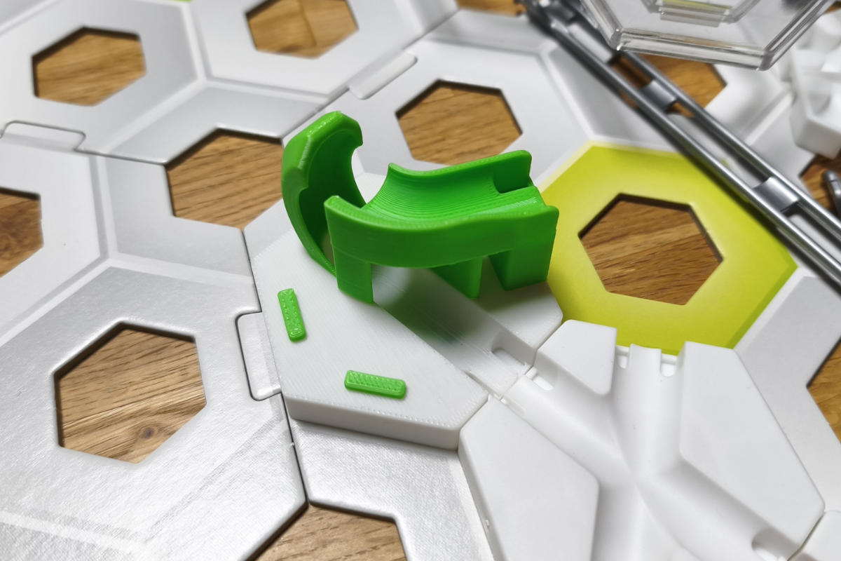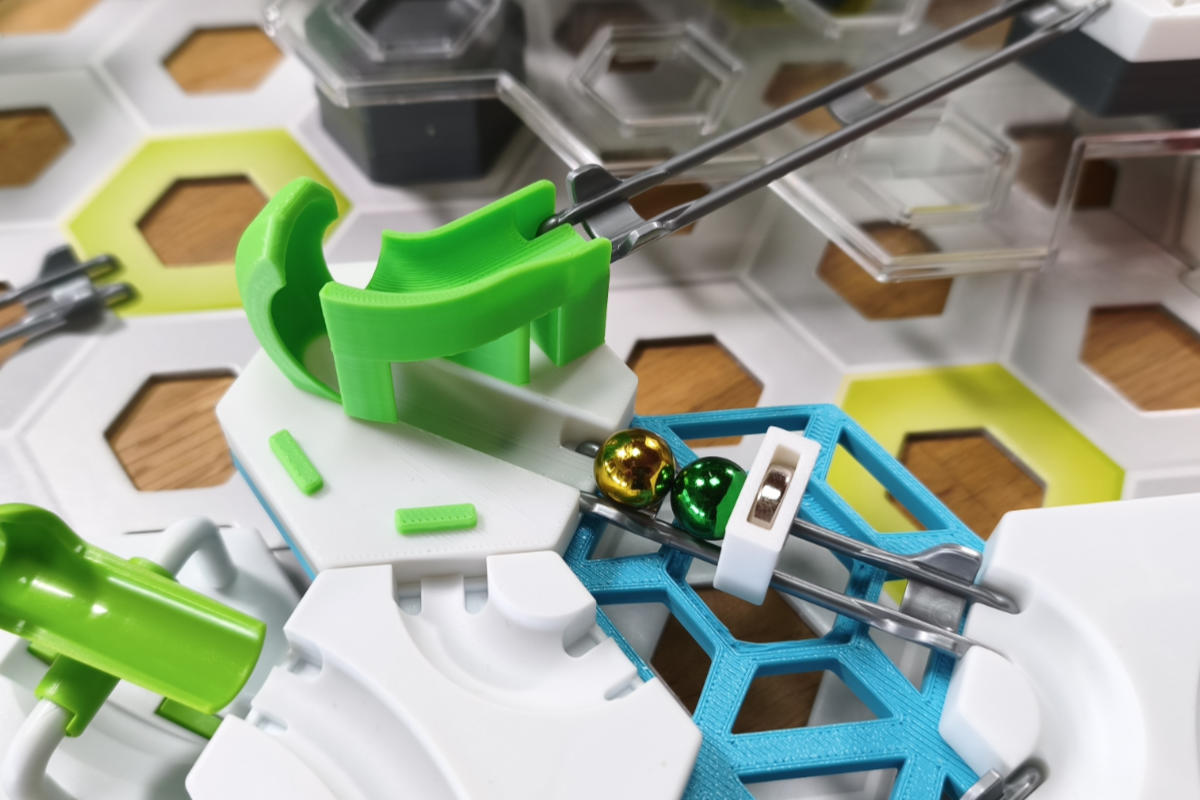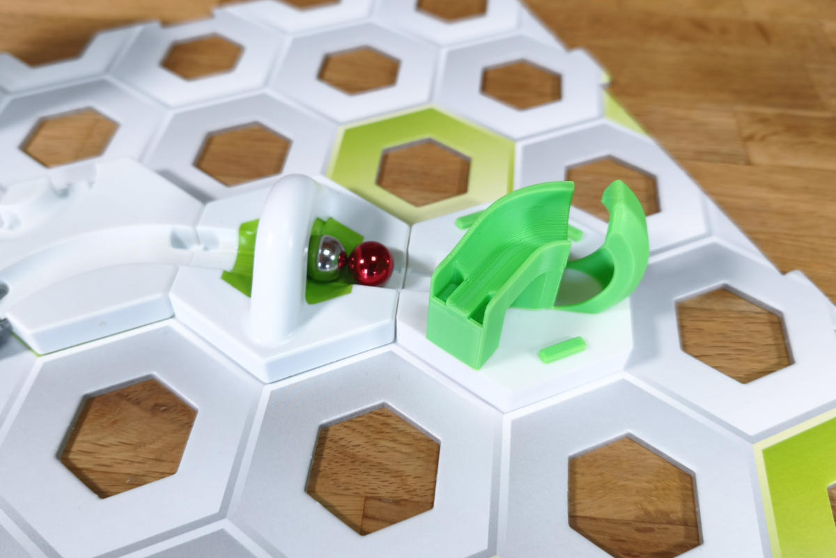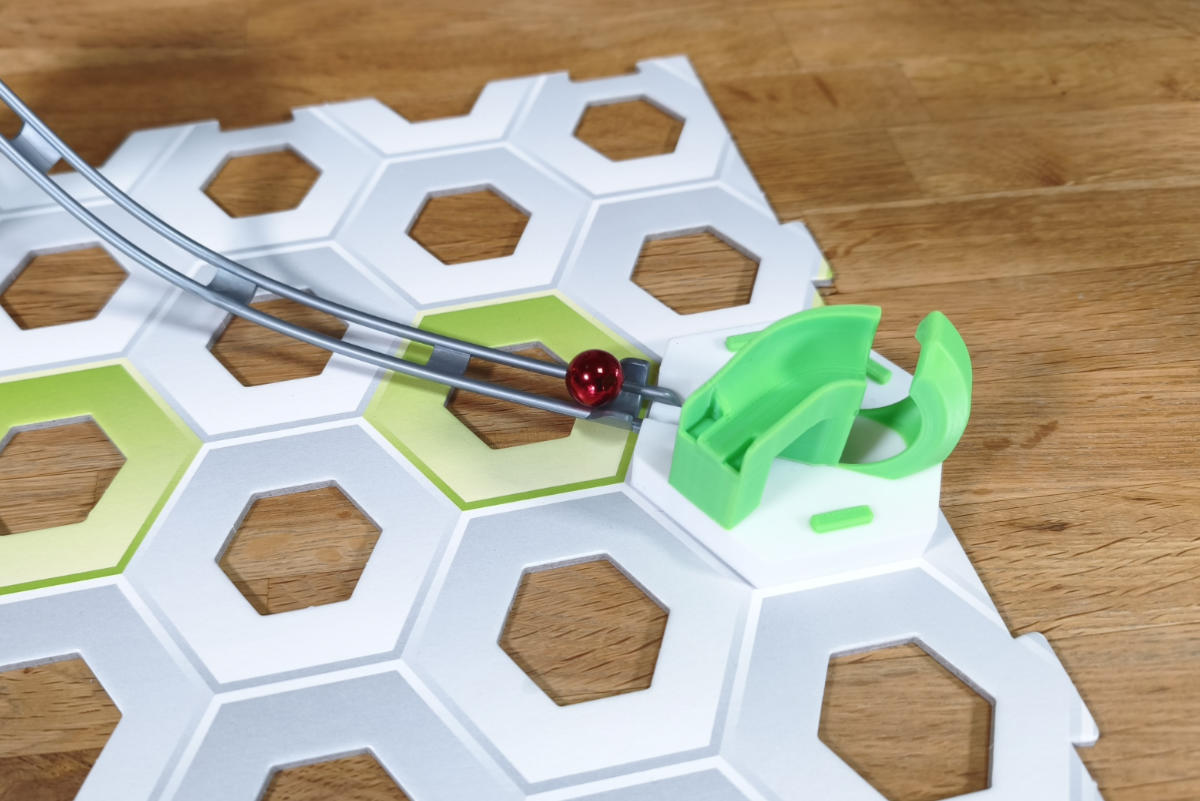 Zwei Kurvenaufsätze leiten die Kugeln nach links oder rechts weiter, der Fängeraufsatz leitet die Kugel ebenfalls nach rechts oder links, aber hinten heraus.