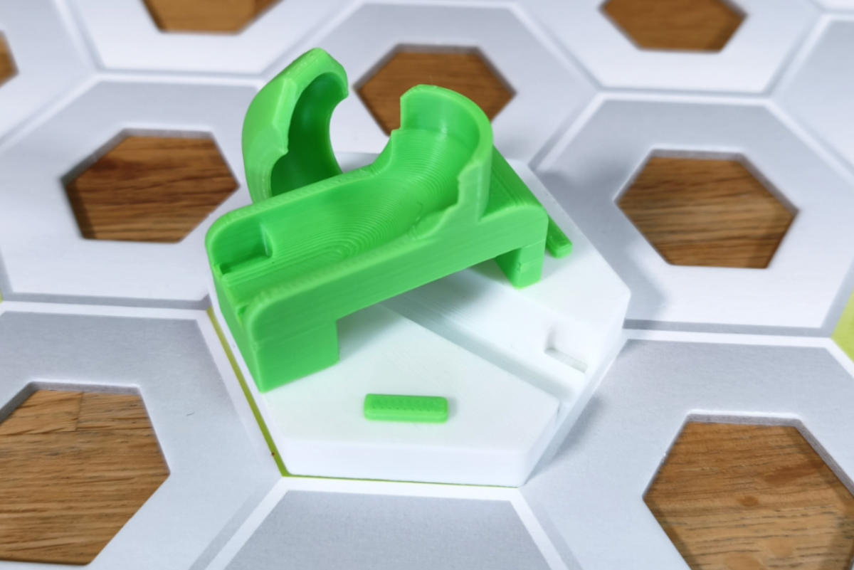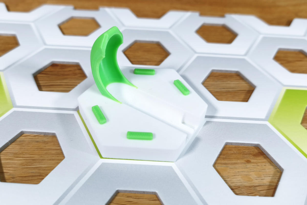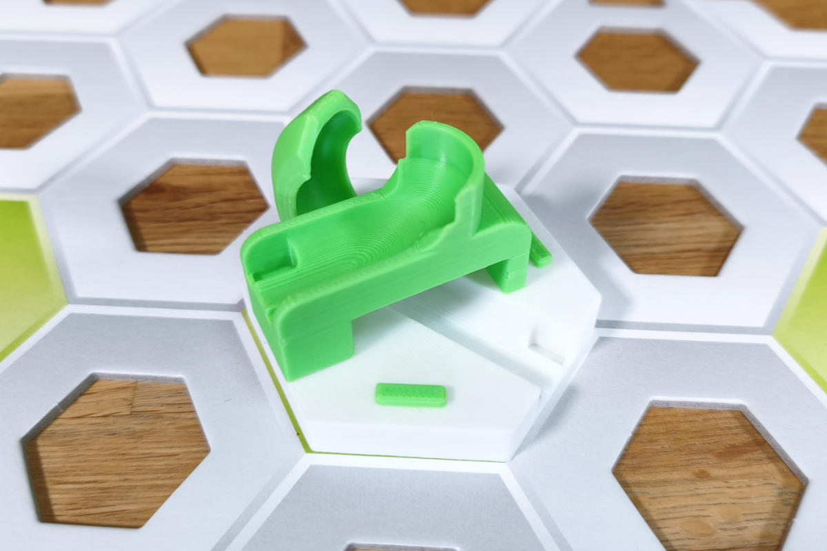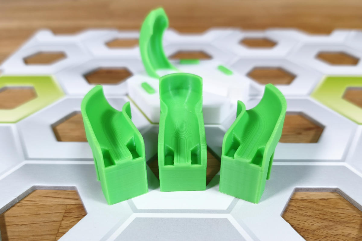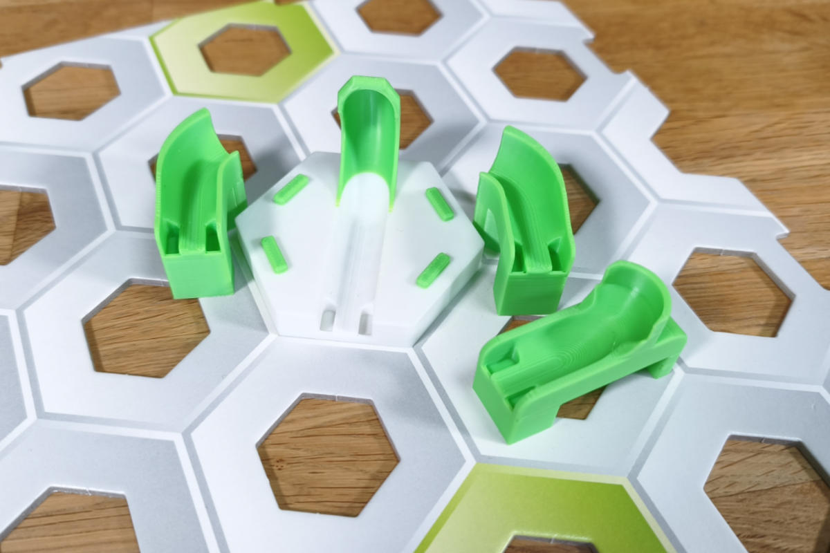 Zwei Kurvenaufsätze leiten die Kugeln nach links oder rechts weiter, der Fängeraufsatz leitet die Kugel ebenfalls nach rechts oder links, aber hinten heraus.