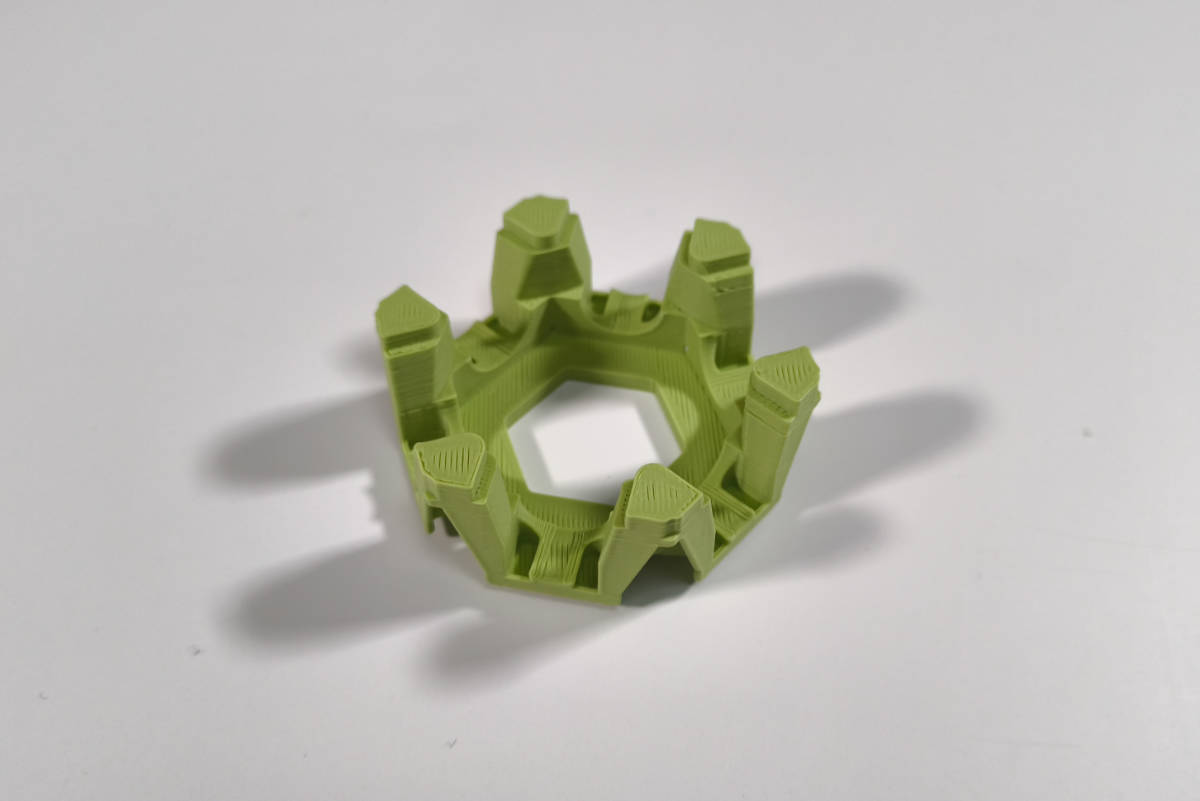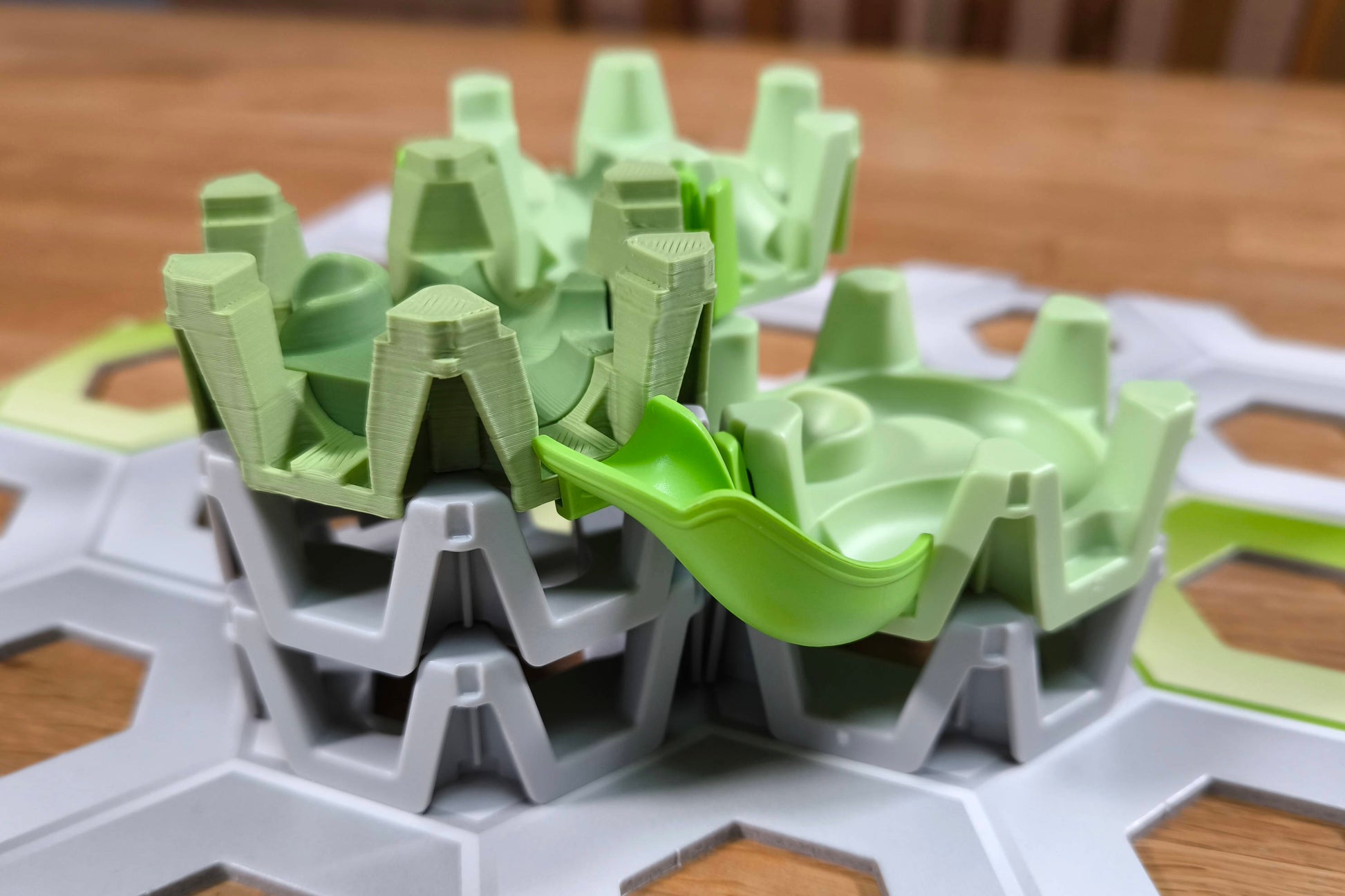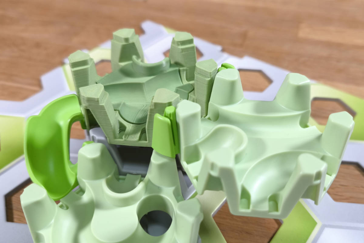 Der Vorteil von SkyBase: Statt Spuren für die Kugeln bietet er eine Öffnung für universelle Einsätze. Es können alle originalen Einsätze von GraviTrax verwendet werden. Uum Beispiel der Splash aus dem GraviTrax-Starter-Set. Das funktioniert aber mit allen anderen 3D-Druck-Einsätzen (hier erhältlich), die in einen normalen Basisstein passen.